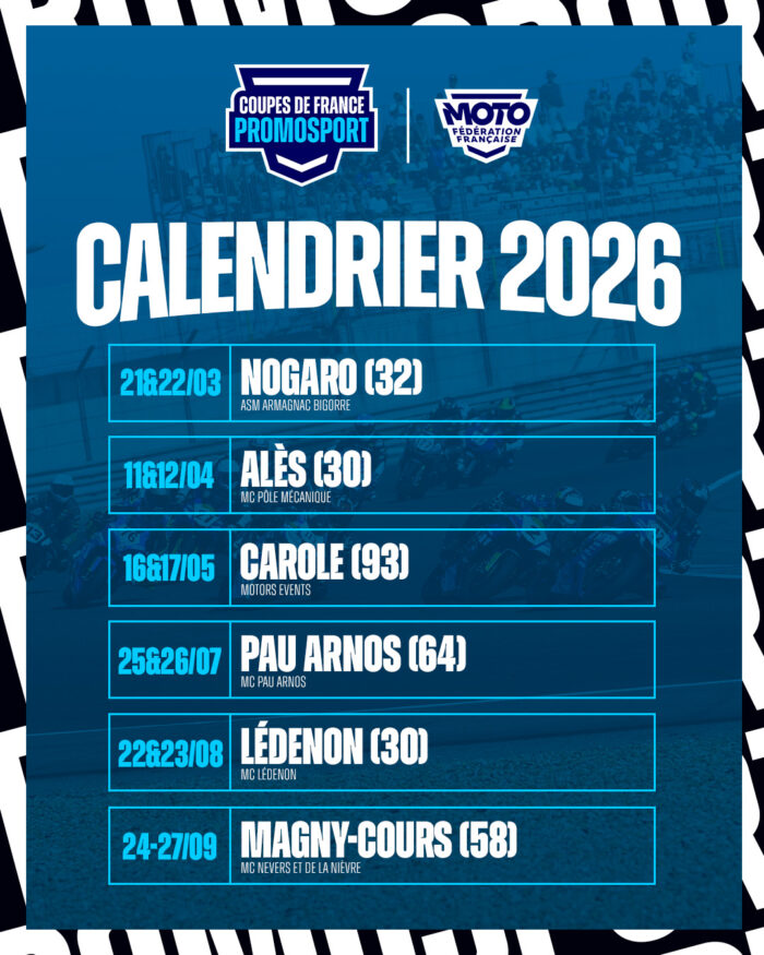 La Fédération Française de Motocyclisme (FFM) dévoile officiellement le calendrier des Coupes de France Promosport 2026. Du cœur du Sud-Ouest jusqu’au mythique circuit de Nevers Magny-Cours, théâtre d’une finale conjointe avec les ténors du FSBK, les Coupes de France Promosport promettent une saison plus attractive que jamais. On notera le retour d’Alès au calendrier.